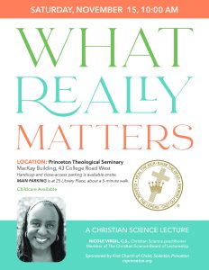 Join us for a free public lecture on Christian Science titled “What Really Matters,” Nicole Virgil, CS, a Christian Science Practitioner and Member of the Christian Science Board of Lectureship. The lecture will take place on November 15, at 10:00 AM at Princeton Theological Seminary, MacKay Building, located at 43 College Road West, Princeton, NJ.